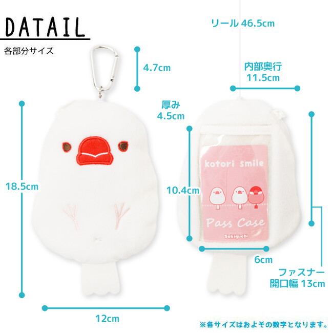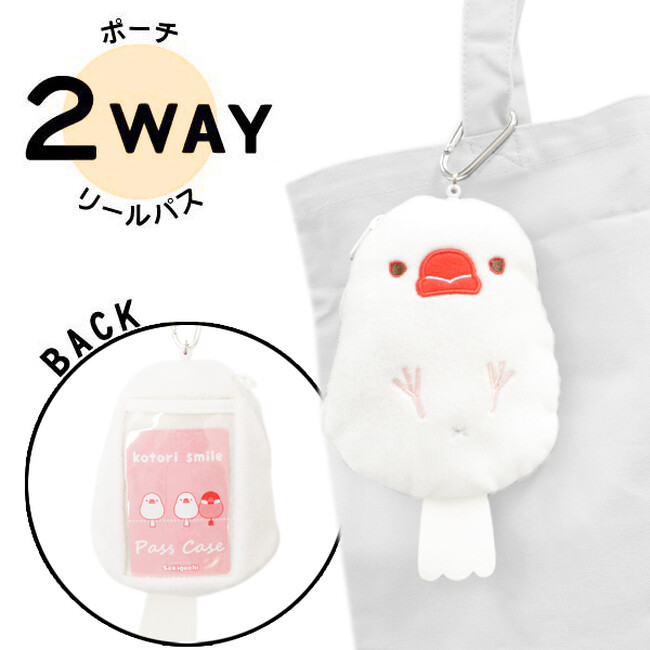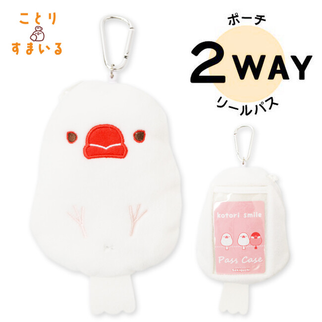 ことりすまいるから、定期入れとポーチが合体したリール付きパスポーチが新登場!白文鳥をモチーフとしたおこ文鳥デザインです♪
