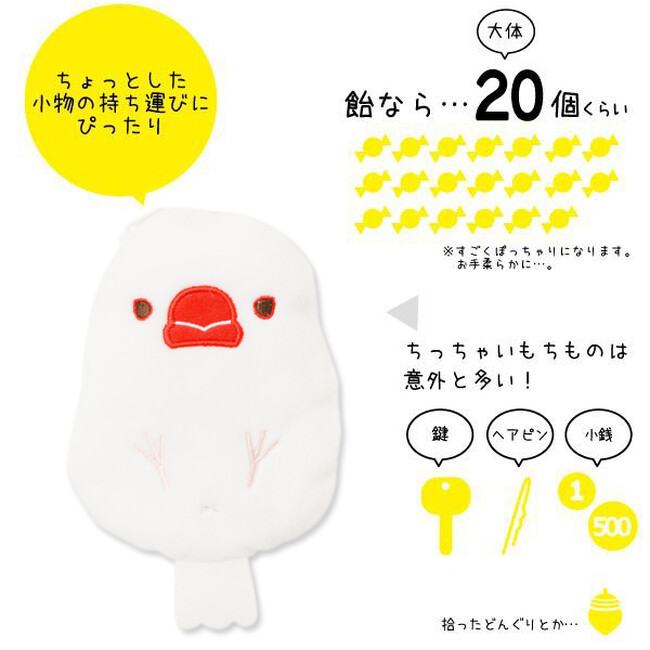 オリジナルのことりグッズを販売する「ことりすまいる」から、白文鳥のリール付きパスポーチが新登場。表情とふっくらボディが魅力的な人気のおこ文鳥デザインです。