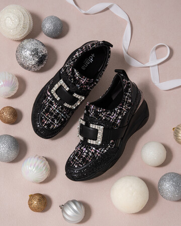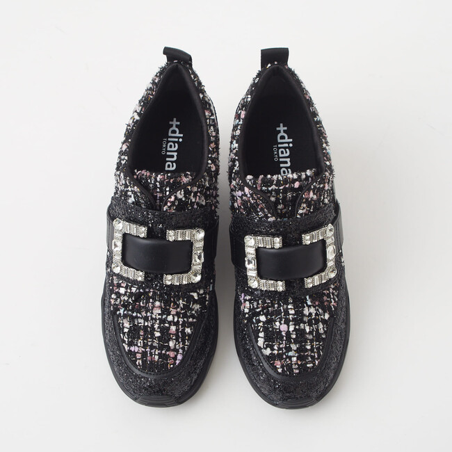 ダイアナ株式会社が展開するスニーカーブランド【+diana】よりクリスマス限定モデル発売のご案内です。+dianaでご好評いただいております6cmヒールアップスニーカーのモデルにツイード生地を載せた、華やかな一足です。ブラックのツイードにグリッターとクリスタルバックルの組み合わせで、程よいフェミニンさと大人っぽさを絶妙なバランスで仕上げました。履くだけでホリデーシーズンを盛り上げてくれるアイテムをぜひお試しください。