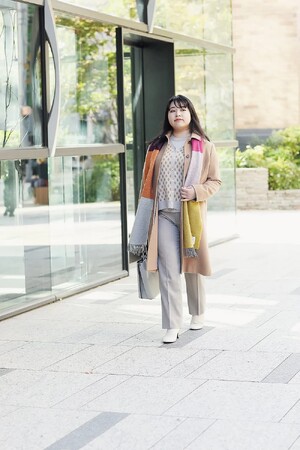 くすみカラーのグレージュをベースにした、落ち着きのある通勤スタイル。コートのキャメル色とリンクしたニットのアーガイル柄は、小ぶりな柄行がすっきり見えるポイントに。カラフルなマルチボーダー柄のマフラーをプラスすれば、暗くなりがちな冬の装いもパッと華やぎます。マフラーは肩から垂らすようにラフに纏うことで、縦長シルエットのコートをより一層シャープな雰囲気に見せてくれます。