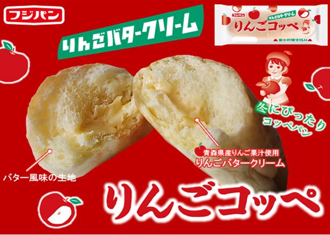 フジパン株式会社(愛知県名古屋市)は、新商品「りんごコッペ」を12月1日より発売いたします。フジパンはロングセラー商品『黒コッペ』をはじめ、季節ごとにコッペパンを展開していますが、主な購入者層は女性が中心となっています。今回の『りんごコッペ』は女性をターゲットに開発を進め、こだわりのコッペパン生地に人気のりんごバタークリームをサンドした新しいコッペパンに仕上がりました。