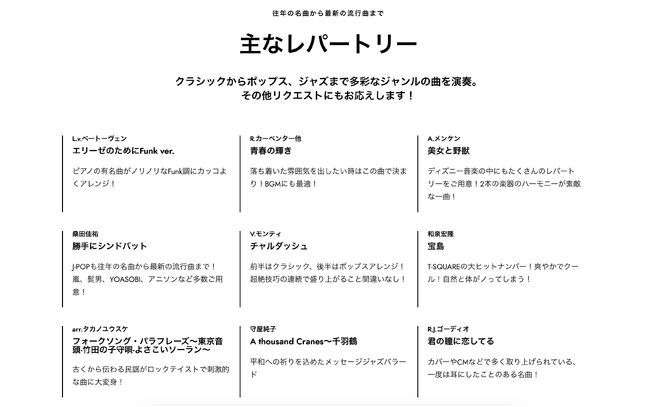 TVやゲーム音楽など耳馴染みのある曲から、クラシックやジャズなどの名曲まで、さまざまなジャンルの音楽を幅広く触れることができます。