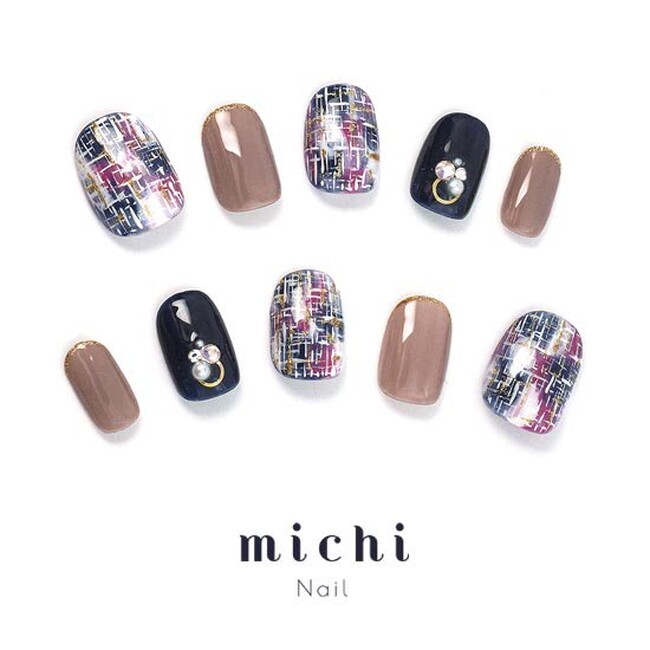 ネイビーが上品なツイードネイル。ツイードネイルはかわいくなりがちですが、ネイビーとベージュを合わせることで、大人っぽく仕上がっています。ゴールドのラメラインとビジューのアートで華やかさも感じられる、冬のデートに使いたいネイルチップです。