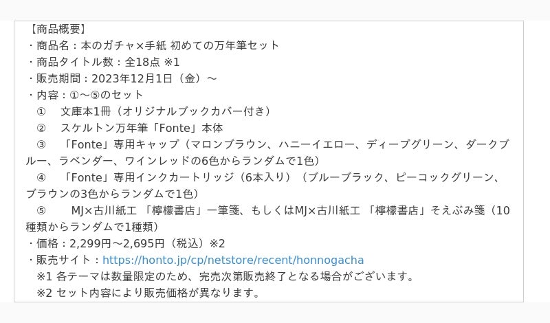 当商品は、「読めば誰かに手紙を書きたくなる本」をテーマにhonto書店員が選書した文庫に、万年筆・インク・一筆箋をセットにした、honto本の通販ストアの人気企画商品「本のガチャ 文庫版」から誕生した商品で、2023年10月に限定発売しました。前回の発売時に大変ご好評をいただいたことをきっかけとし、この度の再販売が決定しました。