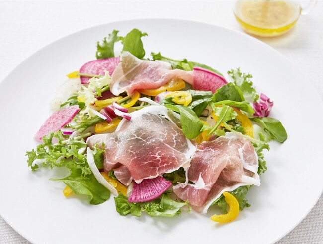 塩味と旨みのバランスが良い北海道産生ハムは、ほろ苦いルッコラと好相性。爽やかでスッキリとしたシャルドネビネガードレッシングで。