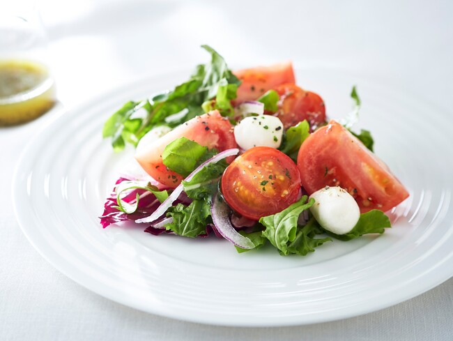 「フルーツトマトと甘とまとのジェノバ風サラダ」¥594(100g)
