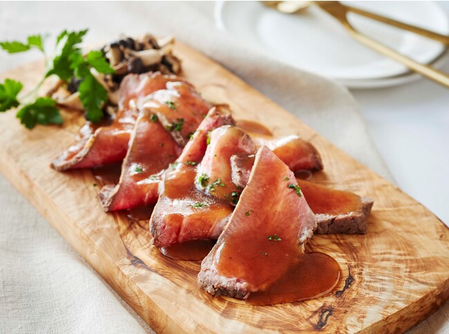 グリルした後にじっくりと加熱することで、表面の香ばしい香りと柔らかな食感、牛肉の旨みを引き出しました。まろやかな味わいのソースが、牛肉とローストした霜降りひらたけの味わいをより一層引き立てます。