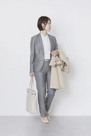 普段の通勤にも使えるオールマイティーなグレーのスーツセットアップは、合わせるアイテム次第でセレモニーシーンにも着用可能。インナーには優しい印象のグリーンのボウタイブラウスで、胸元を華やかに。縦長効果にもなるボウタイで着やせも狙えます。アクセサリーは、ジャケットのラペルに収まるコンパクトなブローチを添えれば祝福ムードもUP。ベルトも華奢なものを選んでバランスを取りましょう。社内での新年の挨拶や取引先との商談にも使える万能コーディネート。