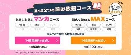 「読み放題 MAXコース」「読み放題 マンガコース」では現在、新規加入者は初回のみ14日間無料での利用が可能となっております。詳細については、読み放題サイトをご覧ください。
