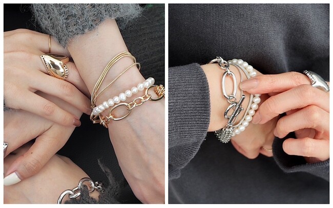 こなれ感を醸し出す3種のチェーンと、上品な淡水パールとのミックススタイルがコーディネートを格上げ。華奢な手元を演出するボリューム感もポイントです。