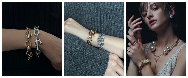 (画像左から)丸みのあるチェーンで女性の手元にも馴染んでつけやすい「Big circle bracelet」、タイプ違いのチェーンが女性の強さと繊細さを表現する「Chain Mix bracelet」、大胆なパール×チェーンの組み合わせが印象的な「Pearl Mix Chain bracelet」を含む全3型をセレクト。