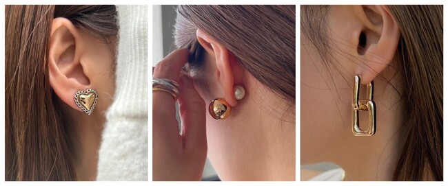 (画像左から)顔周りに大人の遊び心を添える「Heart Chain Pierce」、品のあるパールとメタルボールのギャップのあるコンビネーションが目を惹く「Pearl pierce Set」、芯のある女性像を連想させる存在感のあるチェーンが特徴の「Square Chain Pierce」を含む全5型をセレクト。