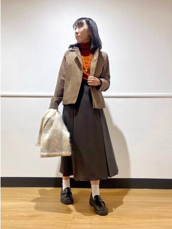 ロングスカートを使った大人の女性のカジュアルスタイルをご提案いたします。オレンジブラウンの秋冬らしい色遣いを意識したコーディネートにしました。