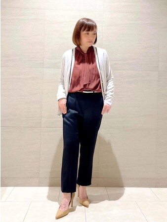 ベーシックなスタイルだけど今年風のコーディネート。トレンドのワイン色のブラウスに黒のテーパードパンツを合わせて大人っぽいスタイルに!さらに金ボタン付きのカーディガンを羽織るだけで、トレンド感のある着こなしに早変わり。