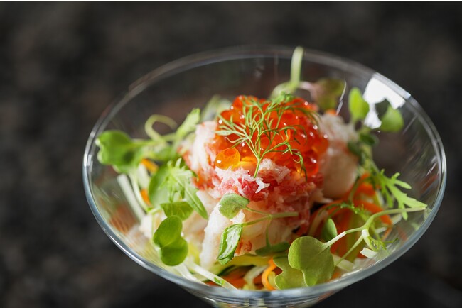 越前ガニと彩り野菜のカクテル仕立て 蟹味噌ソース いくらを添えて