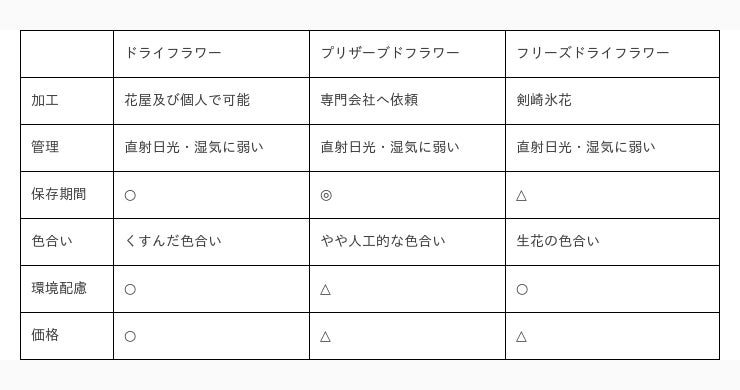 フリーズドライとは、食品等を−35℃程度で凍結し、その状態のまま昇華させることによって、水分を除去・乾燥させる方法。この技術を花に用いたのが、フリーズドライフラワーです。希少な専用機械で加工するため、花の色彩や形状を残すことができ、長期間楽しめるのが、最大の特長。加工工程においても、廃油等を排出しないので、環境配慮されている点もポイントです。