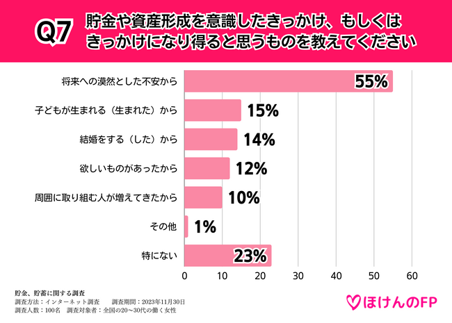 貯金や資産形成を意識したきっかけ、もしくはきっかけになり得ると思うものについて伺ったところ、「将来への漠然とした不安から(55.0%)」と回答した方が半数以上で最も多い結果となりました。