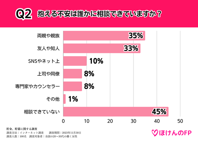 そこで、抱える不安は誰かに相談できているか伺ったところ、「相談できていない(45.0%)」と答えた方が最も多い結果となりました。
