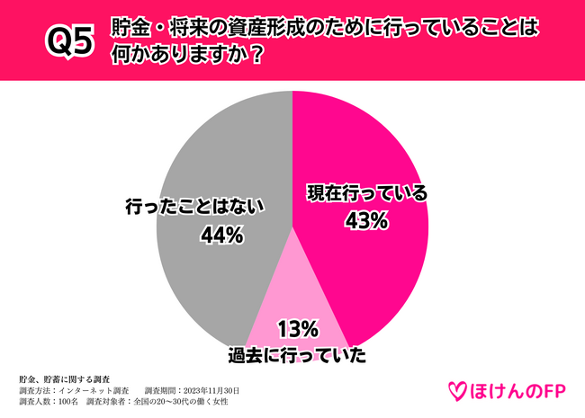 そこで、貯金・将来の資産形成のために行っていることは何かあるか伺ったところ、「行ったことはない(44.0%)」「現在行っている(43.0%)」「過去に行っていた(13.0%)」という回答が集まりました。