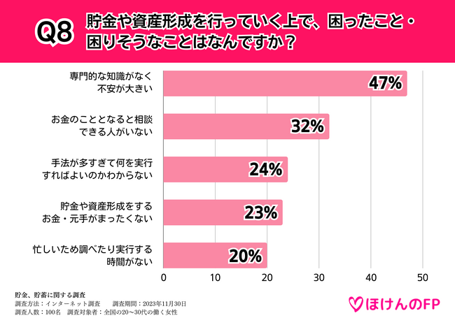 最後に、貯金や資産形成を行っていく上で、困ったこと・困りそうなことについて伺ったところ、「専門的な知識がなく不安が大きい(47.0%)」「お金のこととなると相談できる人がいない(32.0%)」という回答が集まりました。