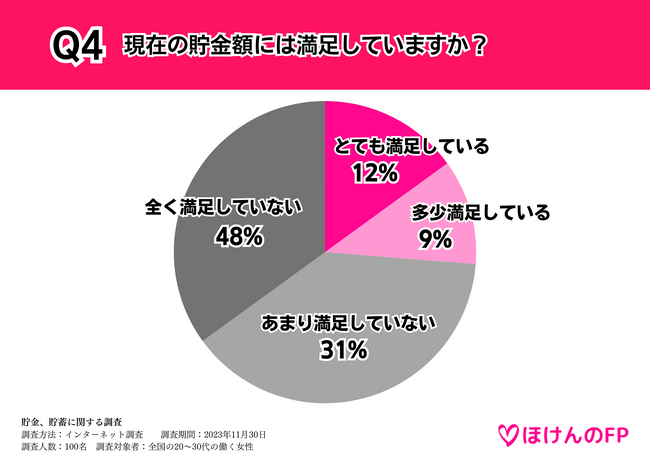 そこで、現在の貯金額には満足しているのか伺ったところ、「全く満足していない(48.0%)」「あまり満足していない(31.0%)」という回答が集まりました。