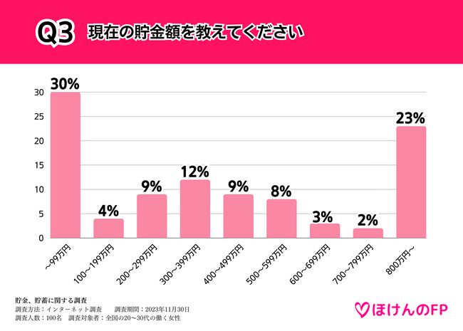 現在の貯金額について伺ったところ、「~99万円(30.0%)」「800万円~(23.0%)」という回答が集まりました。