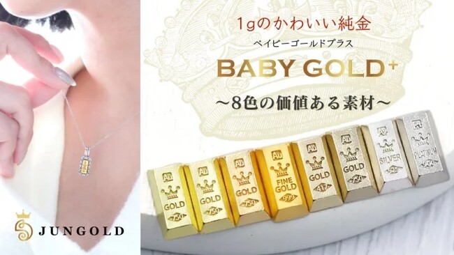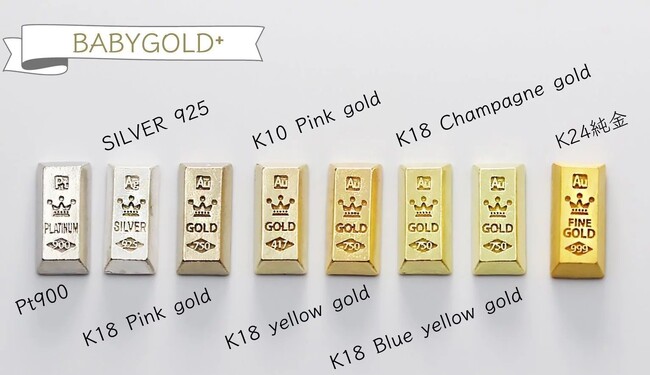 『BABYGOLD+(プラス)』は1gのかわいい純金【BABYGOLD】の新しいシリーズ。8色の価値ある素材でつくるあのカタチ!