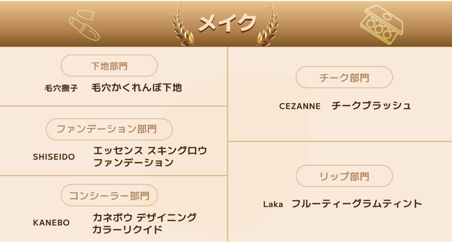 ベースメイクで受賞した「毛穴撫子 毛穴かくれんぼ下地」、「SHISEIDO エッセンス スキングロウ ファンデーション」、「KANEBO カネボウデザイニングカラーリクイド」は、スッピン時の粗さをカバーしながら、元々の肌をよりナチュラルかつ綺麗に見せるような商品となり、近年強まっているナチュラル盛れメイクを象徴するような商品となっている。特にファンデーション部門の「SHISEIDO エッセンス スキングロウ ファンデーション」は、Lemon8では「艶系ファンデーションの頂点」として人気投稿が続出。リップではみずみずしいツヤと潤いが特徴の「Laka フルーティーグラムティント」が受賞。アイシャドウ部門では近年の潮流であるパーソナルメイクを象徴する全108色展開している「KATE ザ アイカラー」が受賞した。