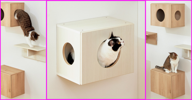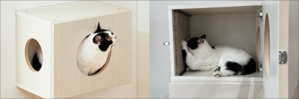 ネコ用タワーを置く場所がない部屋でも、このボックスなら壁に付けるだけなので場所取らず。床に置く場所があるおうちなら、床に置いて複数積み重ねて使うこともできます。階段状に複数台並べて設置すれば、上下運動がしっかりできるので、ネコ用タワー代わりとしても使えます。ネコが入れるキャットボックスタイプ・収納タイプ・キャットステップの3つをお好みで組み合わせることができます。