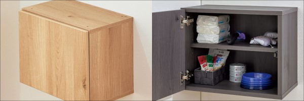 壁に取り付ければ場所をとらない収納ボックス。上に猫が乗っても大丈夫なので、収納庫でありながらキャットステップ代わりに使えます。愛猫グッズの収納にも常備薬や爪切りなどリビングで利用するグッズの収納ボックスとしてご利用いただけます。