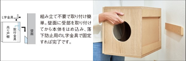 収納ボックスは壁の中に木芯のある壁面もしくは石膏ボード部分に取付が可能です。本体は完成品なので、壁面に受け部をネジで取り付けてから本体をはめ込み、落下防止補助金具を取り付けるだけと簡単です。積み重ねる際は付属の木ダボで固定できます。