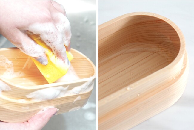 くりぬき弁当箱の製造は、くりぬき加工から研磨、塗装、仕上げまで全てが約10工程で行われています。ウレタン塗装が施された下地は、 油やたれのシミにも強く、おかずの詰め替えに気を使う必要がありません。表面には特殊加工のナノコート塗装が施されているため、 食洗器対応です。