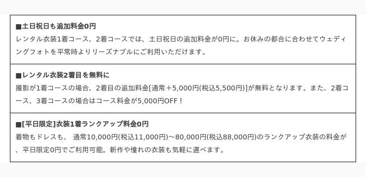 らかんスタジオでご用意しているウェディングフォト撮影は4コース(衣装3着フルセットコース、ドレス&着物2着コース、着物1着コース、ドレス1着コース)。キャンペーン期間中は、土日祝日の追加料金なし、レンタル衣装2着目が無料など、これらの全コースでお得なサービスを提供しています。