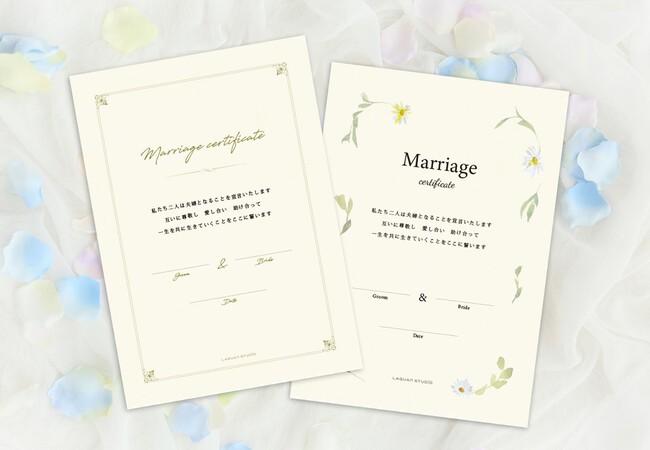 キャンペーン特典のひとつとして、らかんスタジオのオリジナル結婚証明書をご用意。撮影前に新郎新婦に署名いただくことで、結婚式さながらの気分を演出します。お二人で結婚証明書を手にした写真は、結婚式を挙げたような記念として残していただけるので、挙式予定のないカップルにも喜んでいただけるよう企画しました。できあがった結婚証明書は、ウェディングフォトと一緒に撮影することもでき、終了後は記念としてお渡しします。