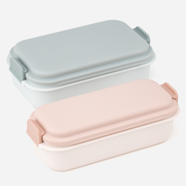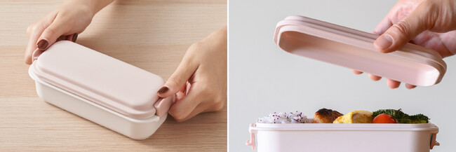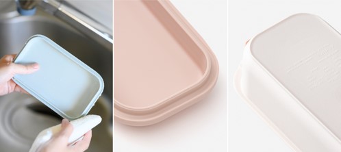 またパッキンと一体化することで溝を少なくしたフタは洗いやすく、洗った後に伏せておいても水が溜まりにくいため、水切れの良さ・乾きやすさもポイントです。本体には無機抗菌剤が使用されているので衛生面も安心です。 そしてフタはふんわりと丸みがあるため、フタをしめてもおかずの中身がつぶれない仕様。中身が盛り付けやすいように本体の高さも低めになっています。お弁当を食べるときは、本体の下にフタを重ねれば、狭い場所でも邪魔になりません。丸みをおびたカタチとカラーは、手に取りやすく可愛らしい印象で、細部にまでこだわりがつまったランチボックスです。