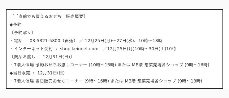株式会社京王百貨店(本社:東京都新宿区、社長:仲岡一紀)では、12月25日(月)から、直前でも買えるおせちの予約承りを開始します。
