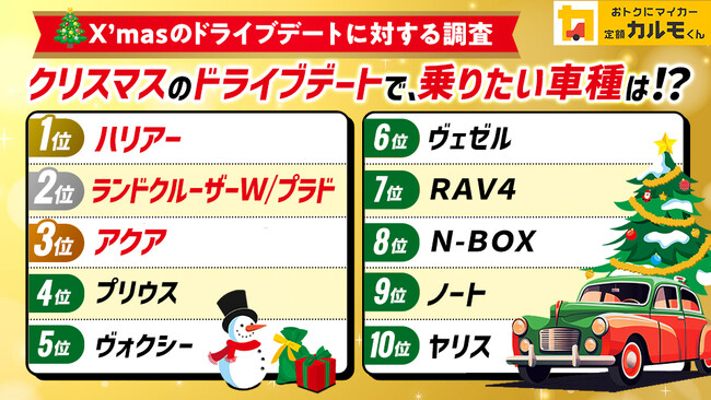 クリスマスデートで乗りたい車No.1は「ハリアー」ドライブデートでかけたい曲No.1は backnumberの「クリスマスソング」