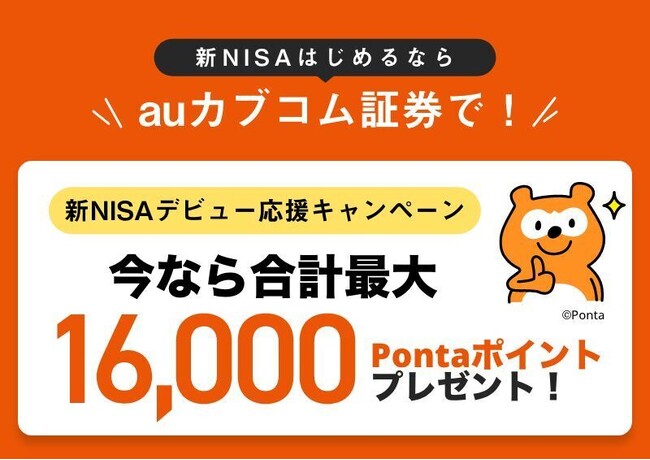 期間中にauカブコム証券のNISA口座を新規開設し、適用条件を満たしたお客さまに、Pontaポイントをプレゼントします。