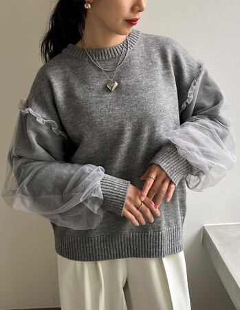 ふんわりとした柔らかい着心地に仕上げた袖チュールニットプルオーバー。