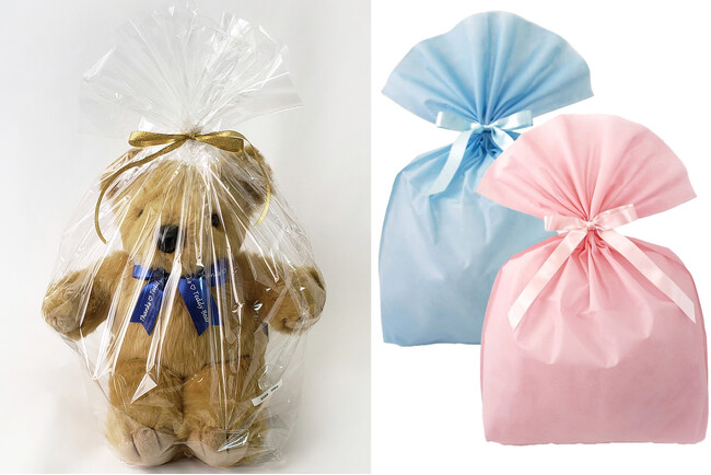 クリアラッピングはくまさん工房からのお祝いとして無料でお付けします。ベアの顔が見え、晴れ着にウェイトベアの毛がつくことを防げくことができます。ピンク・ブルーのラッピングもご用意。ご希望、ご利用シーンに合わせてお選び下さい。