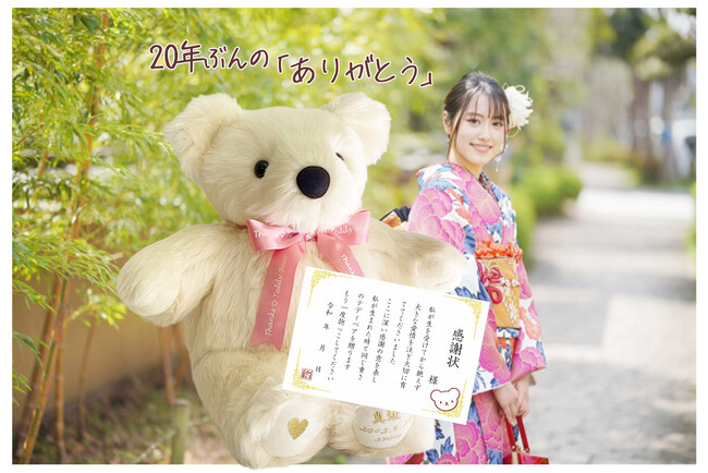 成人の日に、20年前の私を逆プレゼント!生まれた時の重さで作るテディベアでママパパに感謝を伝えます。「感謝状」がより感動を演出。Z世代の新成人に向けた特別な体重ベアのセット。12月1日受付開始