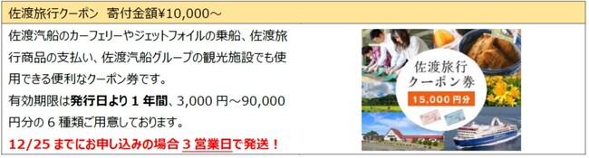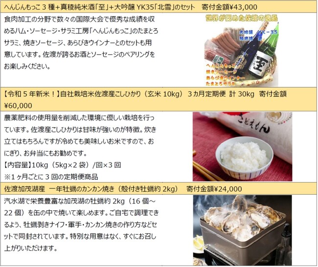 佐渡汽船で運営している新潟県佐渡市へのふるさと納税に特化したポータルサイト「【佐渡市ふるさと納税】サイトOperated by 佐渡汽船 ふる佐渡」では、佐渡汽船のカーフェリーやジェットフォイルのご乗船やグループのホテル・施設で使用可能な佐渡旅行クーポンをはじめ、佐渡産の海産物・お米・港で人気のお土産セットなどをふるさと納税の返礼品として取り扱っております。牡蠣や日本酒などの返礼品が11月から57品増えております。