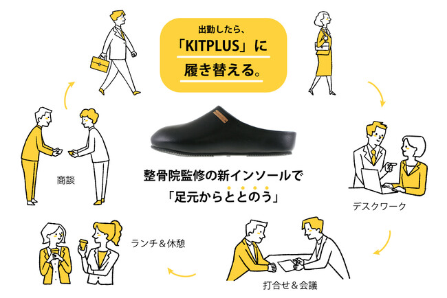 KITPLUS KEEPFITのサンダル1つで、商談からランチまでOK。オフィスに馴染むデザインと解剖学にもとづく3点アーチインソールにより、足元からサポートし、快適なオフィスライフを応援します。