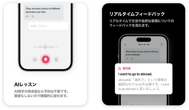 スピークは、ChatGPTを開発している「OpenAI」とパートナーシップを結んでおり、最先端のAI技術を搭載しています。最新のAIと音声認識技術を使用して、不自然な表現や文法のミスまでスピーキングの上達に必要なフィードバックを提供します。また、日本人の発音に最適化された音声認識機能により、まるで本当の人間と会話しているかのような体験が可能です。