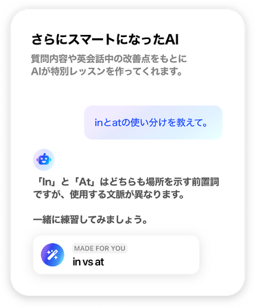 ChatGPTのようなチャット形式で質問ができます。日本語での質問が可能なので、英語が苦手な人でも安心して、英語の文法や語彙の使い方などに関して何でも質問したり、好きな話題について自由に話したりすることができます。さらに、興味のあることに関するカスタムレッスンを受けたり、「スピークチューター」に特定のトピックについてのレッスンを作成してもらうことも可能です!