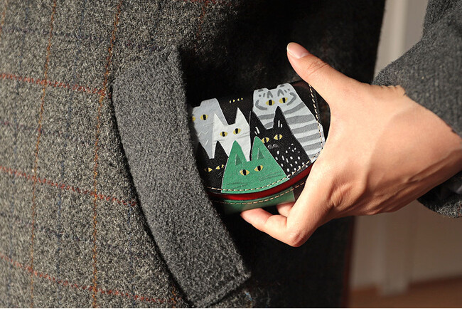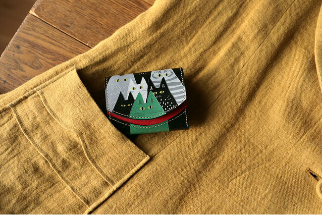 YOSHIDAKEが手がけたアートと過去にもコラボしており、猫と果実がテーマになったゆるかわいいミニ財布と鞄もコラボしています。猫好きの方へのプレゼントにもおすすめです。