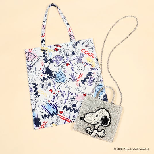 本コラボレーションの一環として、SNOOPY COLLECTIONのバッグ2型(トートバッグ、ミニチェーンバッグ)には、愉快なスヌーピー柄のコットントートバッグが付属されています。