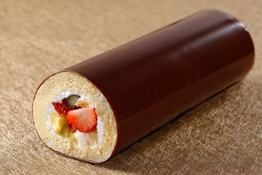 七福神にちなみ、7種類のフルーツを入れたロールケーキを海苔に見立てたチョコレートで巻きました。