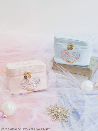 本コレクションではふたりをイメージした水色とピンク色で統一。帆布素材を使用したスクエア型のトートバッグとポーチは、キキ&ララを刺繍で施しました。各アイテムともゴールドのブランドロゴプレートをプラスし、アクセントに。またポーチの上部には星のパーツをポイントで添えました。