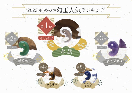 全国で出雲型勾玉を中心とした天然石装飾品店を展開している株式会社めのや(本社:島根県松江市玉湯町、代表取締役社長:新宮福志郎、以下:当社もしくはめのや)は、当社における2022年12月~2023年11月までの1年間に販売した勾玉の実績に基づいて、年間勾玉ランキングを当社ECサイト「AnahitaStyle」内にて発表いたしましたのでお知らせいたします。